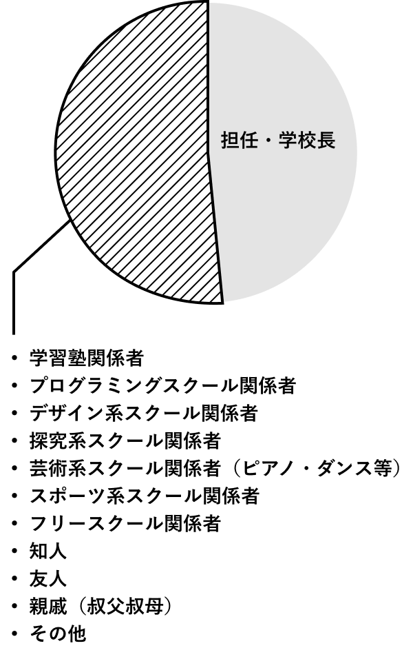 本校の推薦書における特徴の1つ目は、推薦者を学校関係者に限らないとしていることにあります。学校での活動以外にも中学生の活動の場所は広がってきていると考え、先生が把握しにくい様々な課外活動での活躍も記載できるようにしました。結果として、学校関係者と学校関係者以外の推薦者の割合は約1:1程度となりました。