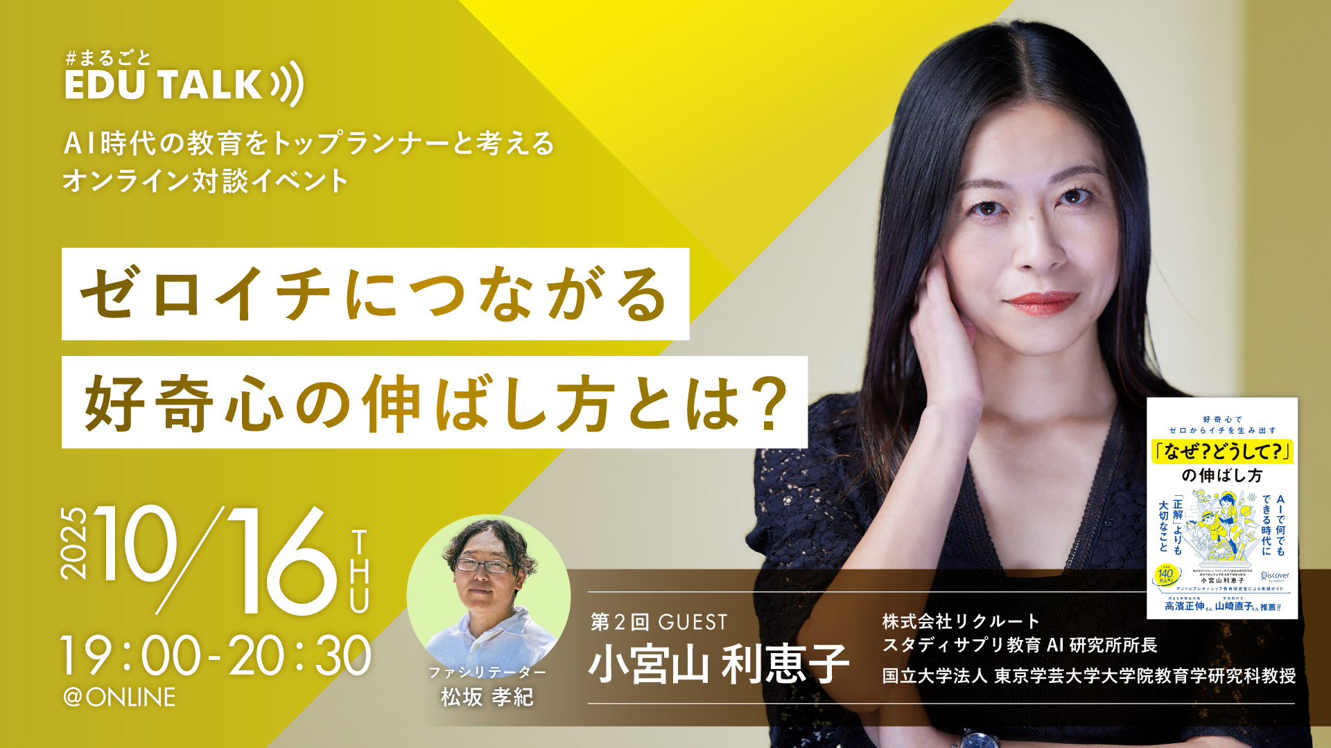 AI時代の教育を考えるオンライン対談イベント「まるごとEDU TALK」Vol.2 10/16(木)開催 ー リクルート スタディサプリ教育AI研究所所長 小宮山利恵子さん「ゼロイチにつながる好奇心の伸ばし方とは?」