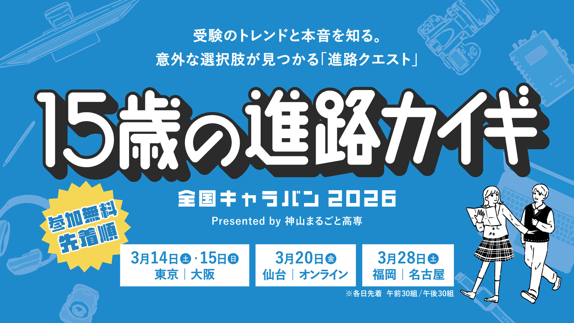 神山まるごと高専は、中学1、2年生を対象とした体験イベント「全国キャラバン2026|15歳の進路カイギ」〜受験のトレンドと本音を知る。意外な選択肢が見つかる「進路クエスト」〜を、3月に東京、大阪、名古屋、仙台、福岡、オンラインの6つの会場で開催します。