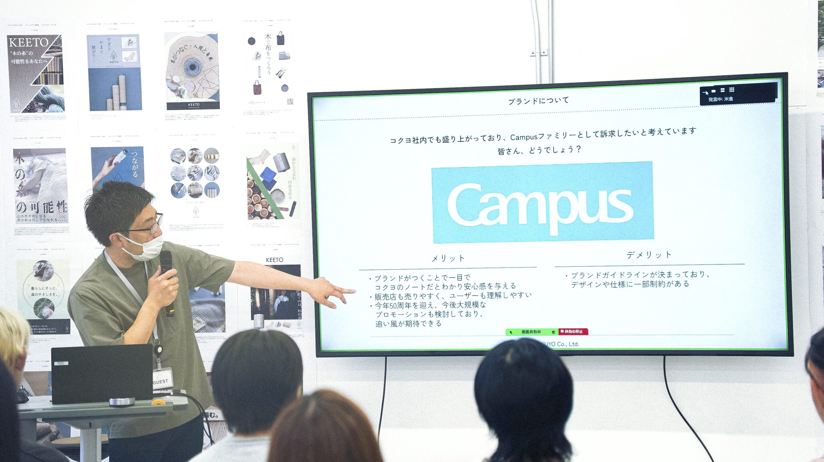 学生全員が、学生自身の原体験を起点に考えた商品企画をコクヨの皆さんへ発表しました。その中から2つの案に絞られ、2つのチームで開発を進めました。市場調査や店舗視察を実施しユーザーの理解を深め、体験までイメージしたノートを開発しました。