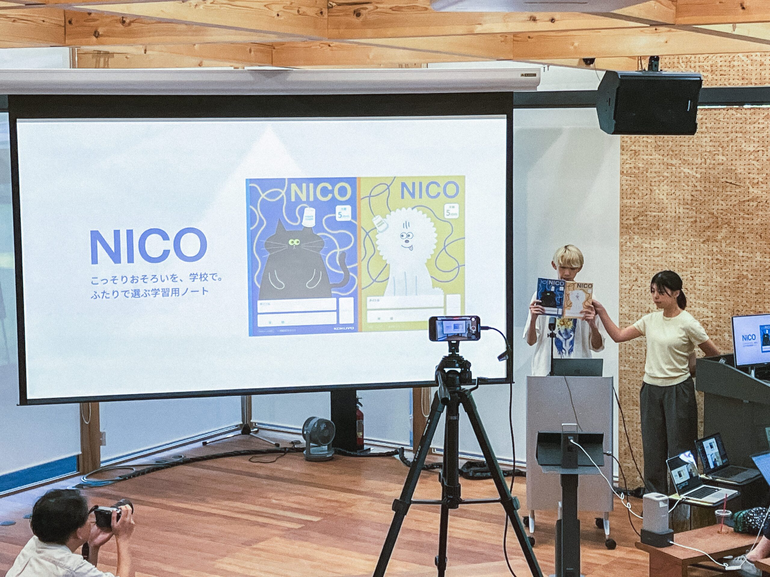 「このプロジェクトは、全体のマネジメントを担いながら、自らアクションを起こし意欲的に取り組んだため、非常に思い入れがあります。私が企画・制作したNICONOTE(ニコノート)』のコンセプトは“おそろいノート”です。小学生の頃、クラスの女子の間で流行った『文房具をおそろいにする』文化に着目しました。ペンや筆箱はおそろいがあるのに、ノートにはそうした商品がないと気づいたことがアイデアの原点です。制作にあたっては、市場調査や工場見学に始まり、紙の選定、プロモーションなどコクヨの社員の方々から専門的な知識を直接学び、感覚だけでなく論理的に企画を深めることができました。表紙デザインも『一つひとつの要素に意図を持つ』ことを意識して自らイラストを描き、可愛らしさと考えた意図を両立させています。約1年にわたり貴重な機会をくださったコクヨさんには感謝の気持ちでいっぱいです。小学生だけでなく、家族・パートナー・友人など誰と買っても楽しめるノートです。ぜひ手に取ってみてください!」