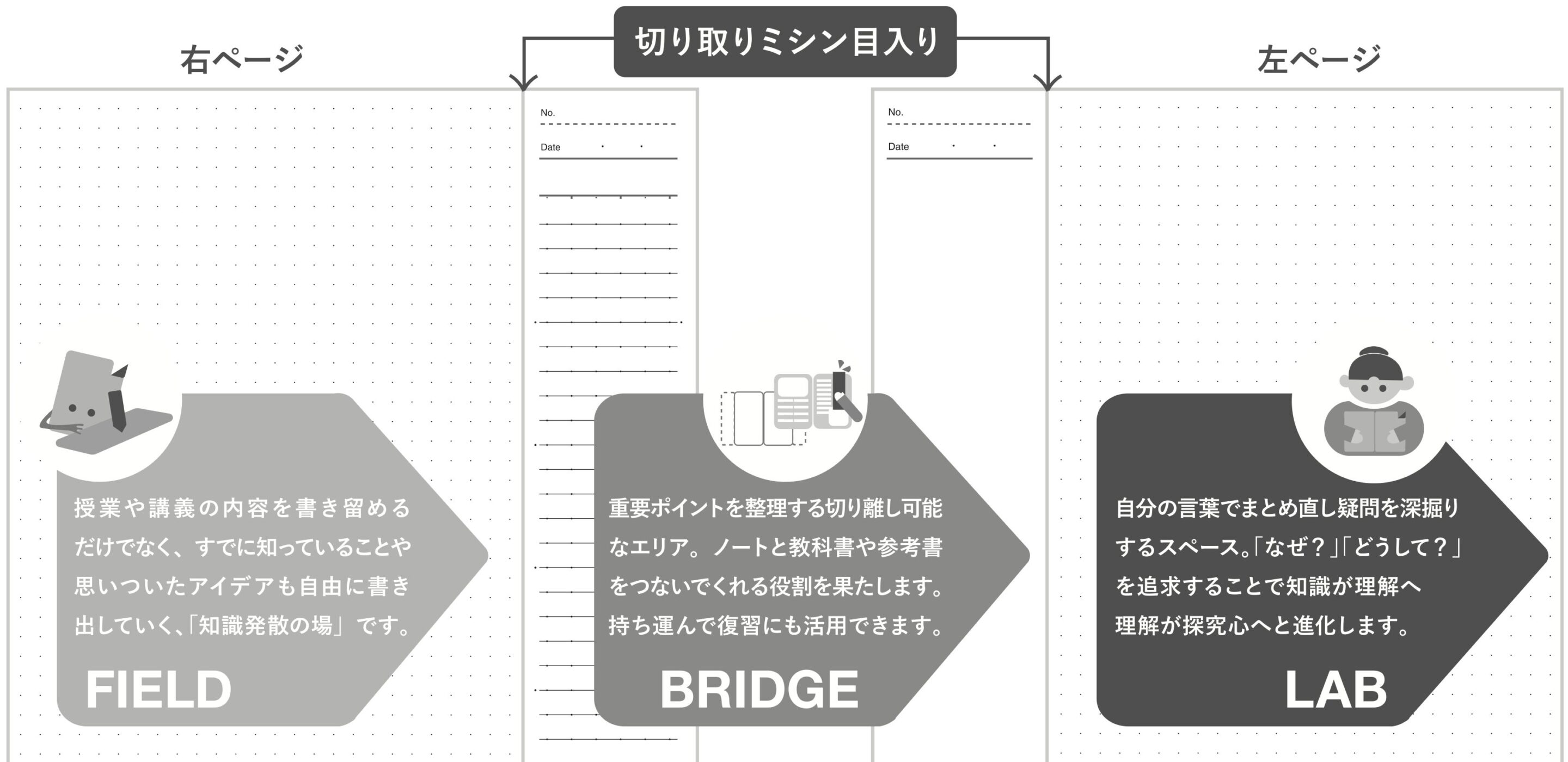 探究学習のサイクルである「発散、収束、思い出し」をサポートする中紙設計となっています。ノートの小口側にはミシン目で切り取れる「しおり」機能付きの縦長のスペースを設けています。切り取ったしおりを教科書に挟むことで、重要な内容をストーリーとして整理する手助けをします。